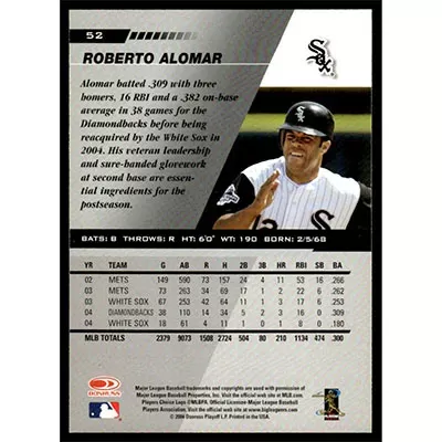 This is a 2005 Leaf Roberto Alomar baseball card. The card is #52 and pictures show condition.