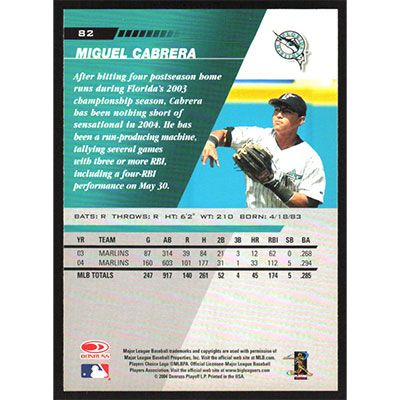 This is a 2005 Leaf Miguel Cabrera baseball card. The card is #82 and pictures show condition.