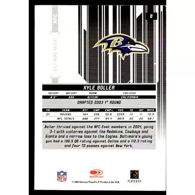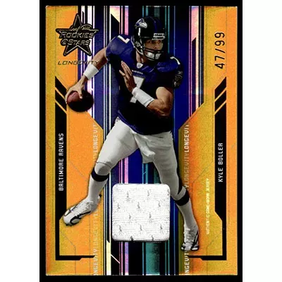 This is a 2005 Leaf Rookies & Stars Longevity Materials Gold Jersey Kyle Boller football card. This card has an authentic piece of game-used jersey, worn by Kyle Boller, embedded in it. The card is #8 and pictures show condition. This card is limited; #'d 47/99.