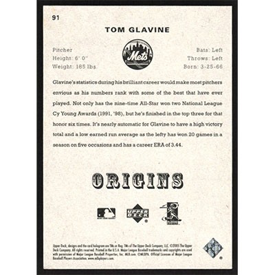This is a 2005 Origins Tom Glavine baseball card. The card is #91 and pictures show condition.