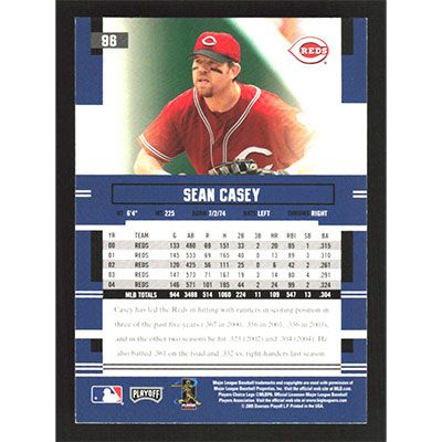 This is a 2005 Playoff Prestige Sean Casey baseball card. The card is #96 and pictures show condition.