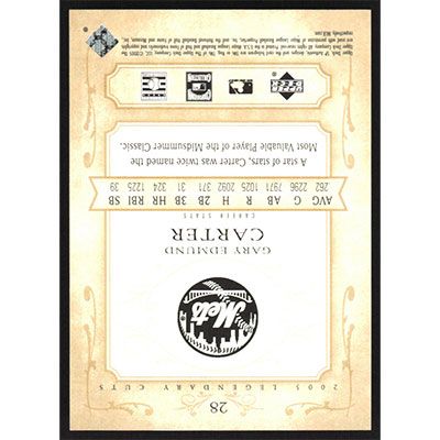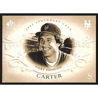 This is a 2005 SP Legendary Cuts Holofoil Gary Carter baseball card. The card is #28 and pictures show condition. This card is limited; #'d 01/50. Team(s): New York Mets