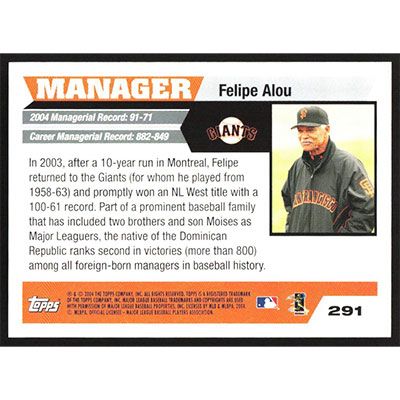 This is a 2005 Topps Felipe Alou baseball card. The card is #291 and pictures show condition.