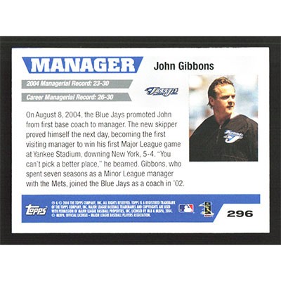 This is a 2005 Topps John Gibbons baseball card. The card is #296 and pictures show condition.