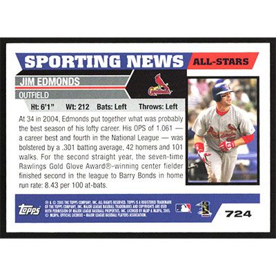 This is a 2005 Topps Jim Edmonds All-Star baseball card. The card is #724 and pictures show condition.