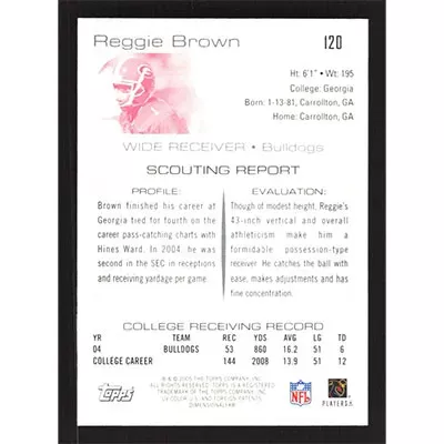 This is a 2005 Topps Draft Picks & Prospects Chrome Reggie Brown football card. The card is #120 and pictures show condition. Team: Georgia Bulldogs Rookie Card