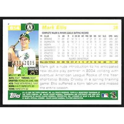 This is a 2005 Topps Gold Mark Ellis baseball card. The card is #614 and pictures show condition. This card is limited; #'d 1630/2005. Team(s): Oakland Athletics