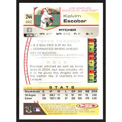This is a 2005 Topps Total Kelvim Escobar baseball card. The card is #244 and pictures show condition.