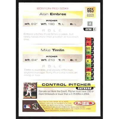 This is a 2005 Topps Total Alan Embree and Mike Timlin baseball card. The card is #665 and pictures show condition.
