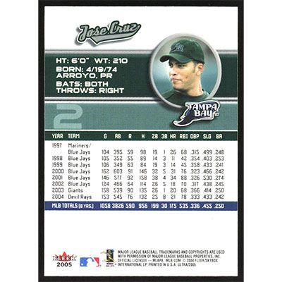 This is a 2005 Ultra Jose Cruz Jr. baseball card. The card is #2 and pictures show condition.