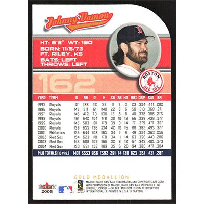 This is a 2005 Ultra Gold Medallion Johnny Damon baseball card. The card is #162 and pictures show condition.