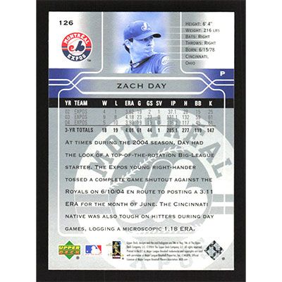 This is a 2005 Upper Deck Zach Day baseball card. The card is #126 and pictures show condition.