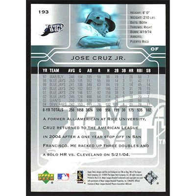 This is a 2005 Upper Deck Jose Cruz Jr. baseball card. The card is #193 and pictures show condition.