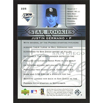 This is a 2005 Upper Deck Justin Germano Star Rookies baseball card. The card is #225 and pictures show condition.