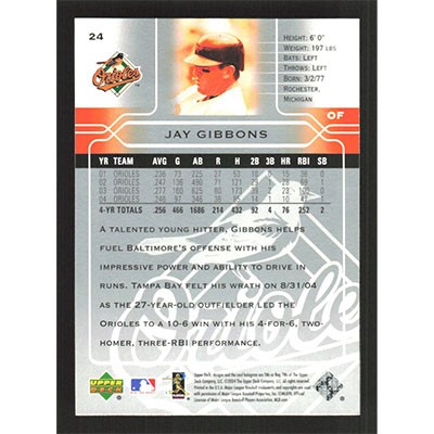 This is a 2005 Upper Deck Jay Gibbons baseball card. The card is #24 and pictures show condition.