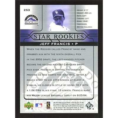This is a 2005 Upper Deck Jeff Francis Star Rookies baseball card. The card is #253 and pictures show condition.
