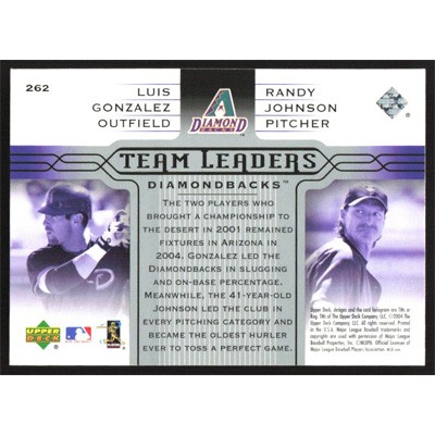 This is a 2005 Upper Deck Luis Gonzalez and Randy Johnson Team Leaders baseball card. The card is #262 and pictures show condition. Team(s): Arizona Diamondbacks
