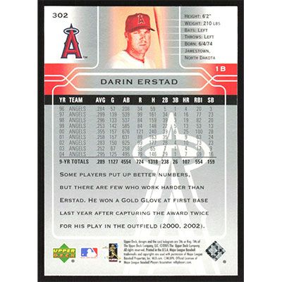 This is a 2005 Upper Deck Darin Erstad baseball card. The card is #302 and pictures show condition.