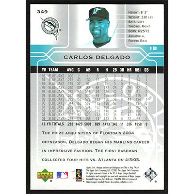 This is a 2005 Upper Deck Carlos Delgado baseball card. The card is #349 and pictures show condition.