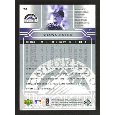 This is a 2005 Upper Deck Shawn Estes baseball card. The card is #70 and pictures show condition.