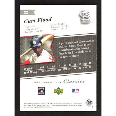This is a 2005 Upper Deck Classics Curt Flood baseball card. The card is #22 and pictures show condition.