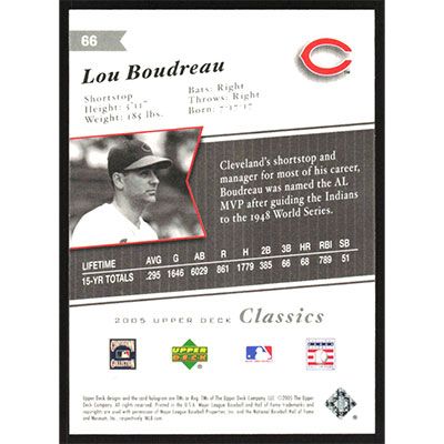 This is a 2005 Upper Deck Classics Lou Boudreau baseball card. The card is #66 and pictures show condition.