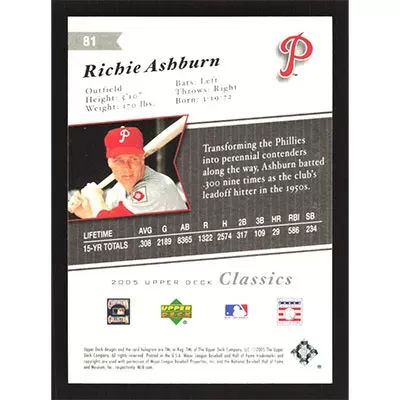 This is a 2005 Upper Deck Classics Richie Ashburn baseball card. The card is #81 and pictures show condition.