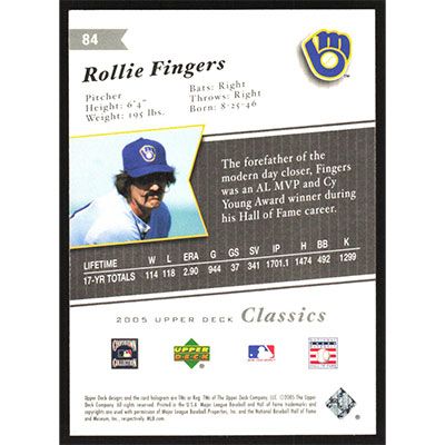 This is a 2005 Upper Deck Classics Rollie Fingers baseball card. The card is #84 and pictures show condition.