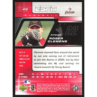 This is a 2005 Upper Deck ESPN Roger Clemens baseball card. The card is #40 and pictures show condition.