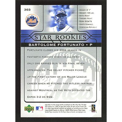 This is a 2005 Upper Deck First Pitch Bartolome Fortunato Star Rookie SP baseball card. The card is #303 and pictures show condition. Team(s): New York Mets Rookie Card (RC)