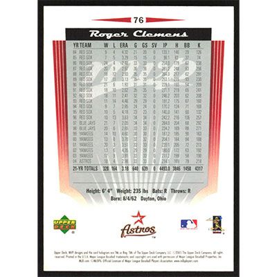This is a 2005 Upper Deck MVP Roger Clemens baseball card. The card is #76 and pictures show condition.