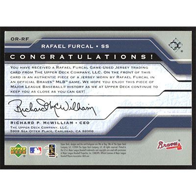 This is a 2005 Upper Deck Origins Jersey Rafael Furcal baseball card. The card is #OR-RF and pictures show condition.