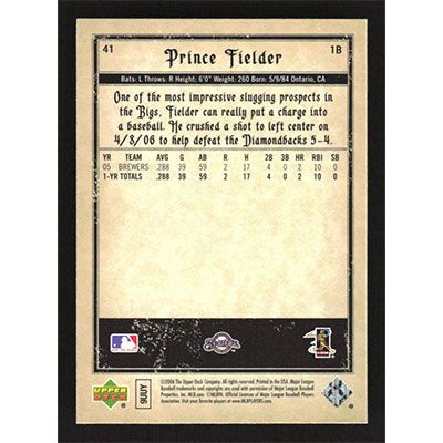This is a 2006 Artifacts Prince Fielder baseball card. The card is #41 and pictures show condition.