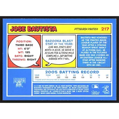 This is a 2006 Bazooka Blue Fortune Jose Bautista baseball card. The card is #217 and pictures show condition. Team(s): Pittsburgh Pirates Rookie Card (RC)