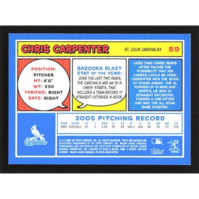 This is a 2006 Bazooka Blue Fortune Chris Carpenter baseball card. The card is #89 and pictures show condition.
