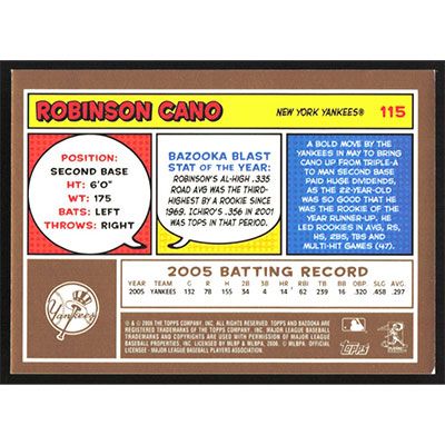 This is a 2006 Bazooka Gold Chunks Robinson Cano baseball card. The card is #115 and pictures show condition.