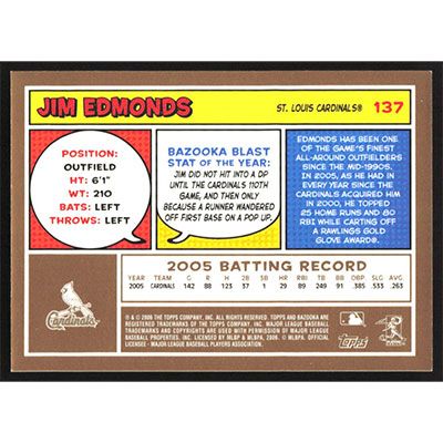 This is a 2006 Bazooka Gold Chunks Jim Edmonds baseball card. The card is #137 and pictures show condition.