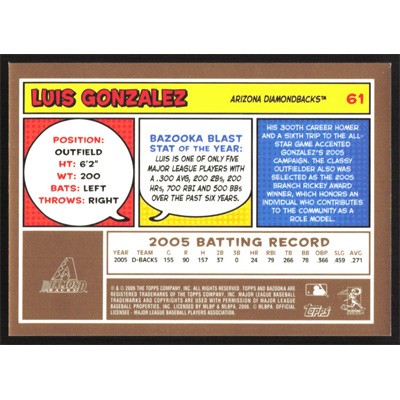This is a 2006 Bazooka Gold Chunks Luis Gonzalez baseball card. The card is #61 and pictures show condition.