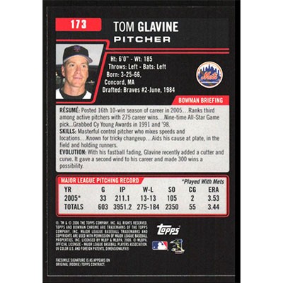 This is a 2006 Bowman Chrome Tom Glavine baseball card. The card is #173 and pictures show condition.