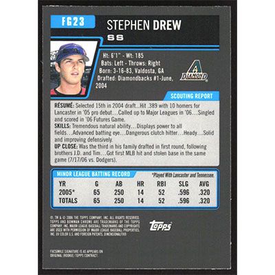 This is a 2006 Bowman Chrome Draft Futures Game Prospects Stephen Drew baseball card. The card is #FG23 and pictures show condition. Team(s): Arizona Diamondbacks