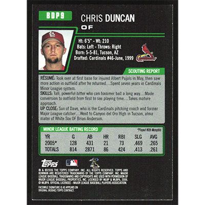 This is a 2006 Bowman Draft Chris Duncan baseball card. The card is #BDP9 and pictures show condition. Team(s): St. Louis Cardinals Rookie Card (RC)