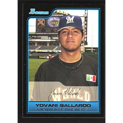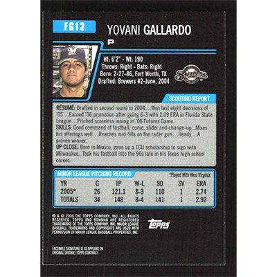 This is a 2006 Bowman Draft Future's Game Prospects Yovani Gallardo baseball card. The card is #FG13 and pictures show condition. Team(s): Milwaukee Brewers