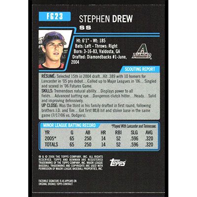This is a 2006 Bowman Draft Futures Game Prospects Stephen Drew baseball card. The card is #FG23 and pictures show condition. Team(s): Arizona Diamondbacks