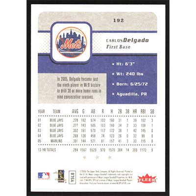 This is a 2006 Fleer Carlos Delgado baseball card. The card is #192 and pictures show condition.