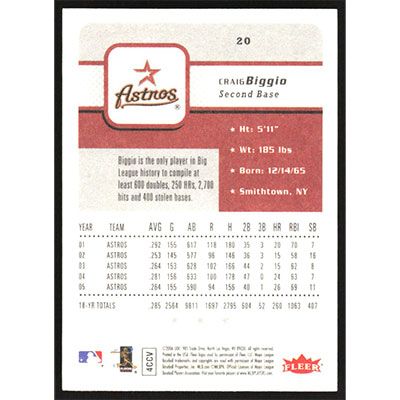This is a 2006 Fleer Craig Biggio baseball card. The card is #20 and pictures show condition.