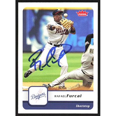 This is a 2006 Fleer Rafael Furcal autographed baseball card. This card has been signed, in blue, by Rafael Furcal, and is guaranteed authentic by Ballcardz.com. The card is #66 and pictures show condition.