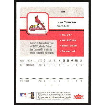 This is a 2006 Fleer Chris Duncan baseball card. The card is #89 and pictures show condition.