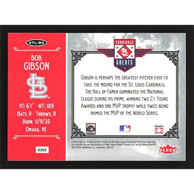 This is a 2006 Fleer Greats of the Game Cardinals Greats Bob Gibson baseball card. The card is #STL-BG and pictures show condition. Team(s): St. Louis Cardinals