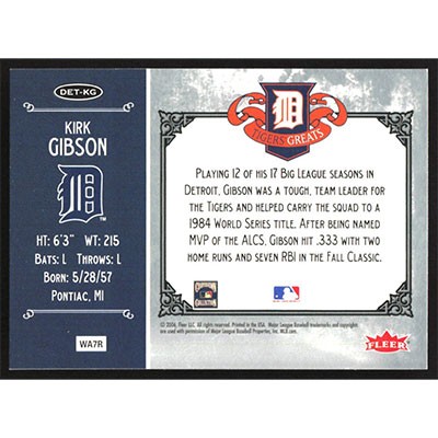 This is a 2006 Fleer Greats of the Game Tigers Greats Kirk Gibson baseball card. The card is #DET-KG and pictures show condition. Team(s): Detroit Tigers
