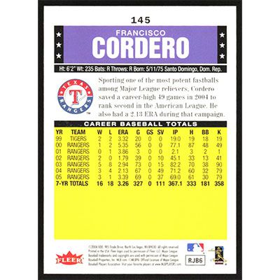 This is a 2006 Fleer Tradition Francisco Cordero baseball card. The card is #145 and pictures show condition.
